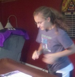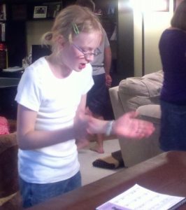 If you have more than 2 students: Students stand facing each other at a table (other students would line up evenly on both sides). The teacher gives a 2 measure prep beat and the first student claps the first measure.  Without missing a beat, the facing student claps the next measure. After each student claps a measure, they move to the side of the table, and let the next student be in their place for the next measure. If anyone misses a rhythm or skips a beat, they sit out for the rest of the round. At the end, when there were only 2 students left, the first student claps a measure then turns around in a circle while the other student claps the next measure turning around after completed…going back and forth. It is a dizzying blast!