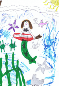 My mermaid is bright and kind and would never hurt a creature. But she loves, loves, loves rock and roll and she lives on her guitar in the bright, blue sea.