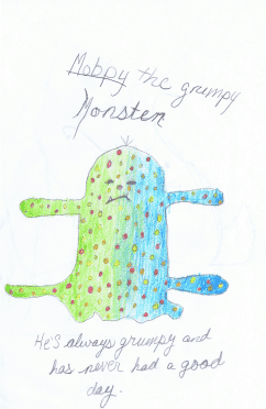 Mobpy is always grumpy because other monsters make fun of him because he is so colorful. They would never let him play slime-ball with them. Mobpy lives alone in a dump and everywhere he goes he leaves slime.