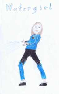 Watergirl is a very powerful superhero with many different powers, all of which have to do, obviously, with water. She is able to shoot water out of her hands, melt into a water puddle, walk on water, breathe underwater, draw large bodies of water to her, ride on paths of ice, bring water to dry spots, cause storms, make tsunamis (and other big waves), and shoot beams of water out of her eyes. She is very sweet, ecstatic, and just however, and she is a valued hero in her superhero group, known as the League of Superheroes.