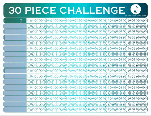 The 30 or 40 Piece Challenge is a year-long program that challenges students to learn more music. As you know, when students play through and learn more music at different levels, they become better sight-readers. And the more exposed they are to different kinds of music, the more fluent they are in different styles, different notation, formats, and other such things. The 30 or 40 Piece Challenge was created by Elissa Milne, and we have created these charts over the years with her blessing.