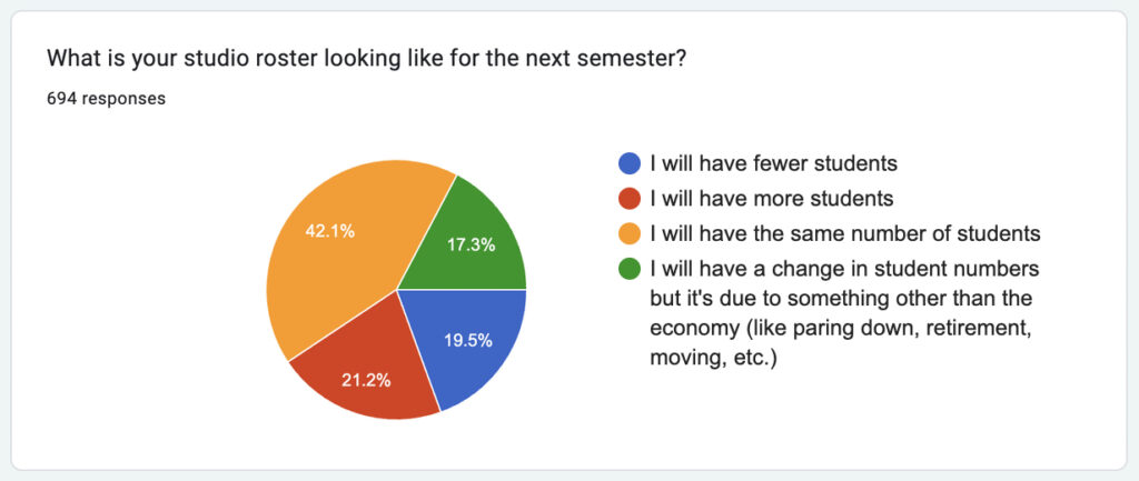 I am one of the teachers who responded to the survey with the answer that I either didn’t know or wasn’t sure (can’t remember exactly how the question was phrased or my exact answer ☺️ ) how the economy would impact my studio this year. Unfortunately I now know that I am noticing parents are slower in making their monthly payments. At this point, I am giving reminders and it has worked. I haven’t needed to do this in the past so it’s odd and definitely something I am monitoring in case I need to make policy adjustments in the future. It might be a warning sign? Time will tell! Interesting that I had just double checked some accounts and then received your email.