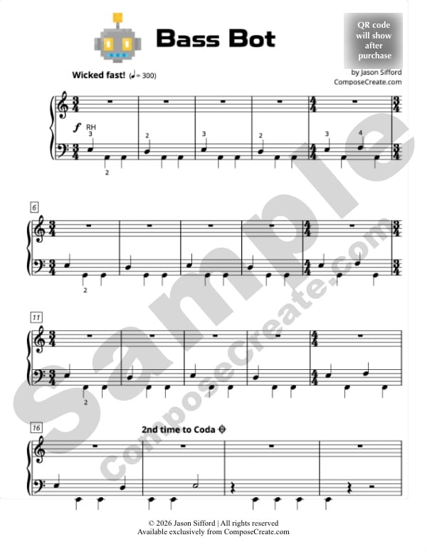 Bass Bot is written in common time, but features a beginning section with shifting time signatures between triple meter and common time. The smallest note value is a quarter note. The largest interval is a fifth. There is pedal indicated sparingly in this piece, perfect for beginning pedalers. The student gets to choose their ending, either “Victorious!” or “Defeated!”