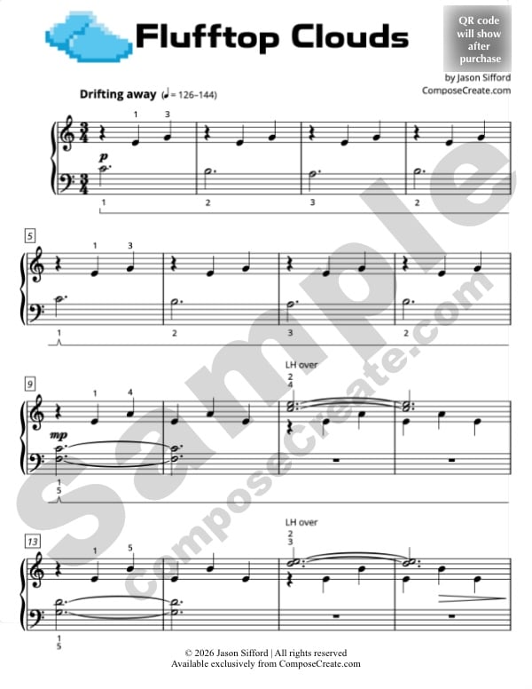 Flufftop Clouds is written in triple meter. It has a relaxed waltz pattern. The smallest note value is a quarter note. The largest interval is a fifth. The motive involves the left hand occasionally crossing over the right. Legato pedaling is indicated, but changes are at the beginning of each line, making it a great piece for reviewing pedaling.