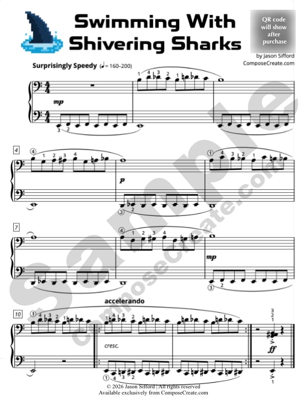 Swimming with Shivering Sharks is written in common time. The smallest note value is the eighth note. The largest interval is a third. Both hands play in the bass clef. This piece features fun half steps and repetitive, small chromatic motives. The half steps and accidentals are easily taught by Rote and Reading®. Students will love the accented fortississimo ending!