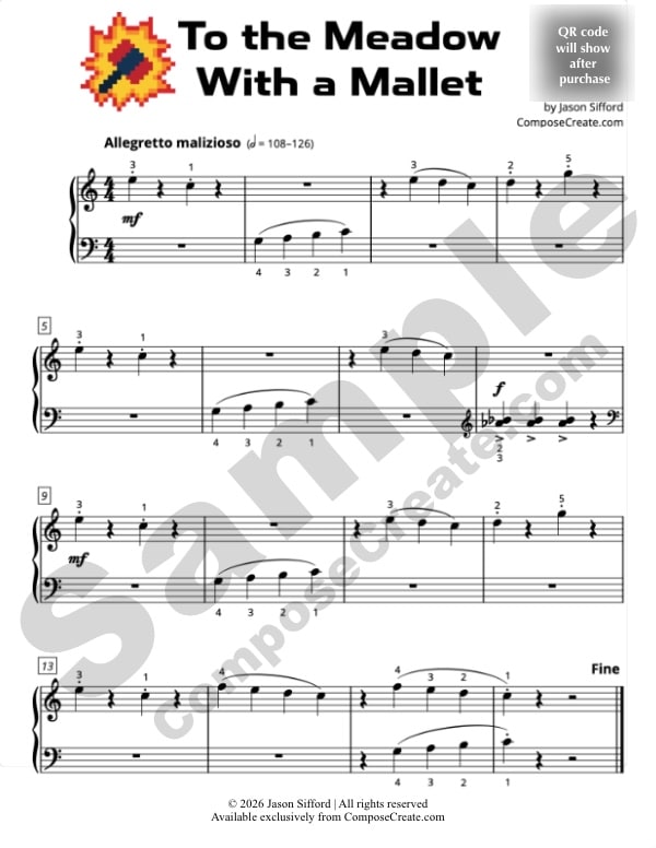 To the Meadow with a Mallet is in common time. It features legato, staccato, and accent marks – perfect for reviewing articulations. The biggest interval is a fifth. The smallest note value is a quarter note. There are accidentals in the piece, such as the sound of the mallet on two black keys; these are easily teachable by Rote and Reading®. This piece does not feature pedaling.