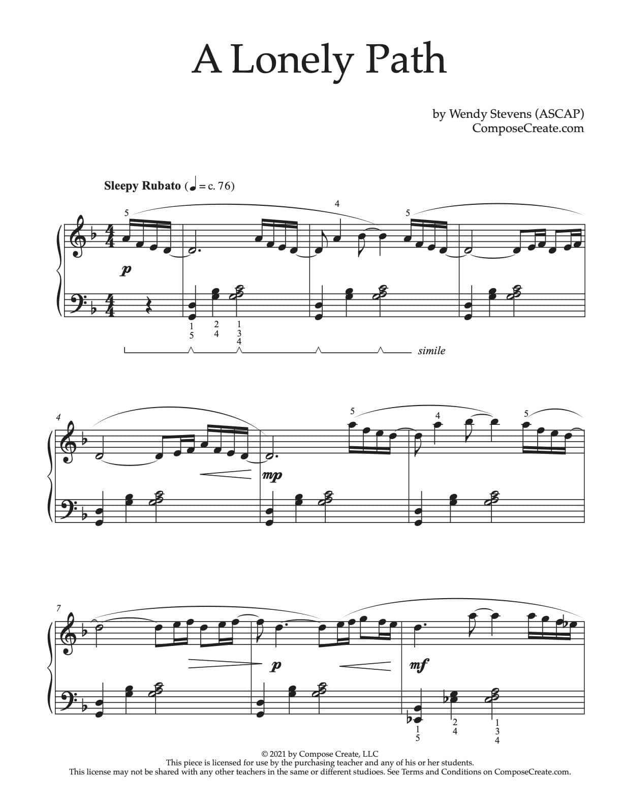 In addition to receiving the music and the cover (this is always included for ComposeCreate® pieces), you’ll also receive one free mp3 recording of A Lonely Path performed by Wendy Stevens. This recording does not have any voiceovers so it will helpful for you and students in learning the piece. You are permitted to send this recording to your students who are working on the piece.