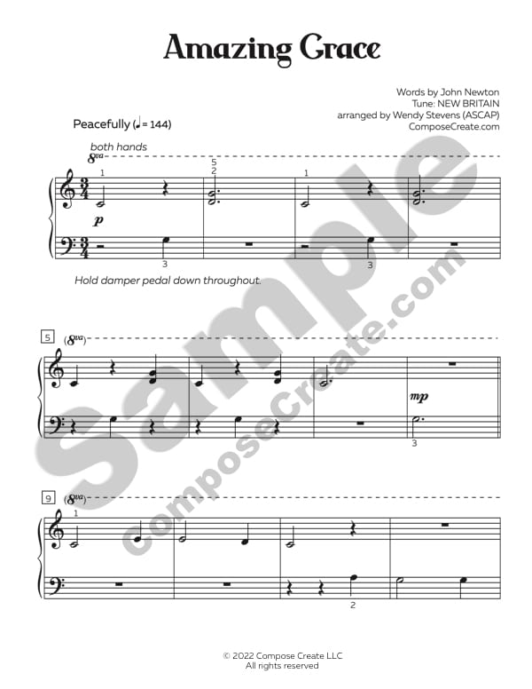 This Amazing Grace Easy Hymn Solos piece also includes an mp3 recording of arranger Wendy Stevens performing the piece. Teachers are permitted to send the mp3 to students to help them learn or shape the piece more easily.