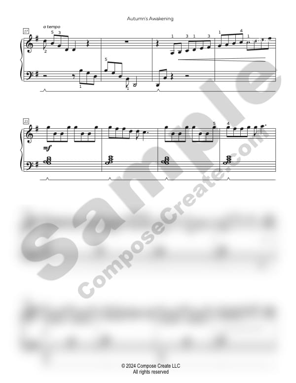Autumn’s Awakening is an early intermediate piece in G Major. This piece is in common time, and begins with a cascading “hand over hand” section that moves to left hand bringing melody notes. This section will create confident music readers who have a way to showcase their ability. A right hand scale pattern leads to a beautiful lyrical section that’s excellent for teaching nuance.