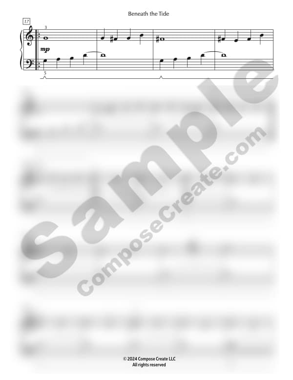 Beneath the Tide is mid elementary and is written in G Major but the accidentals are all included, so there is no key signature. The largest interval is a fifth and the smallest note value is the quarter note.