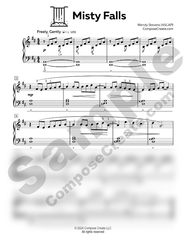 Beyond the Trail pieces are late elementary. The smallest note value is an eighth note. There is mild syncopation and tied notes throughout. All three pieces have an indicated key signature of D Major. Misty Falls and Shallow Creek have pedal indicated clearly. All three of the one-page pieces have pedagogical fingerings indicated.