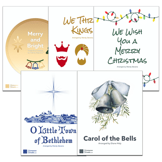 This set of 2020 Holiday Piano Music set includes music from mid elementary to mid intermediate level by Wendy Stevens and Diane Hidy.