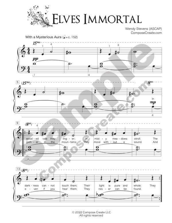 Elves Immortal is a late elementary piece written in D lydian. The accidentals are written in, rather than a key signature being given. There are also accidentals outside of the D lydian mode sprinkled through several measures. The smallest note value is a quarter note. Multiple registers are explored, which is what gives the piece its somewhat ethereal and imaginative quality. Pedaling is indicated throughout the entire piece, and held for long sections, making it attainable for students at this level.