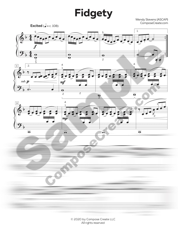 I had a good feeling they would fit one of my students. Boy, was I right. She LOVED them. She’s typically joyful about the songs I choose, but these three she really went nuts for. (She chose to learn “Fidgety” first.) Today I decided to share them with another student to see if she had a similar reaction. She is a great student, but as she’s “growing up” now, she’s not as vocal or excited in her lessons. She chose to learn “Stoked” first. Her body transformed! Her posture became tall and engaged and she was really studying the notes. It was so great for me to see this reaction from two of my students. I look forward to purchasing more of your music!