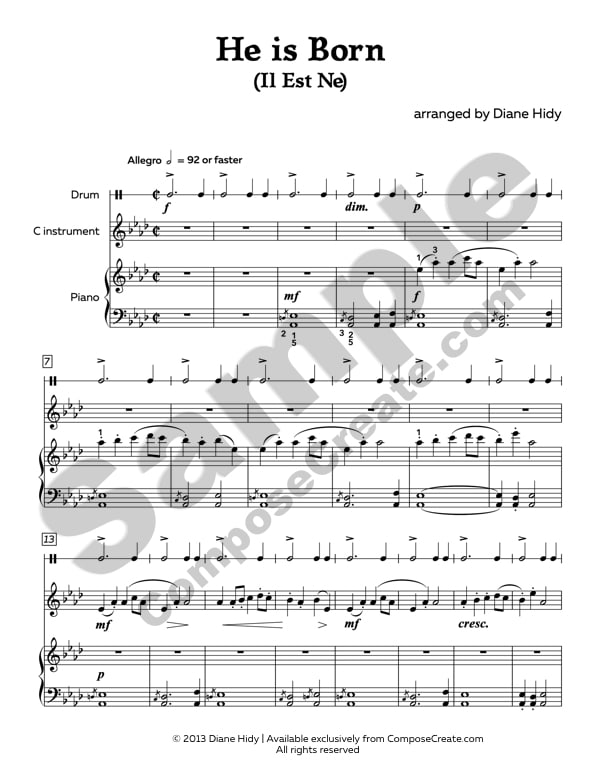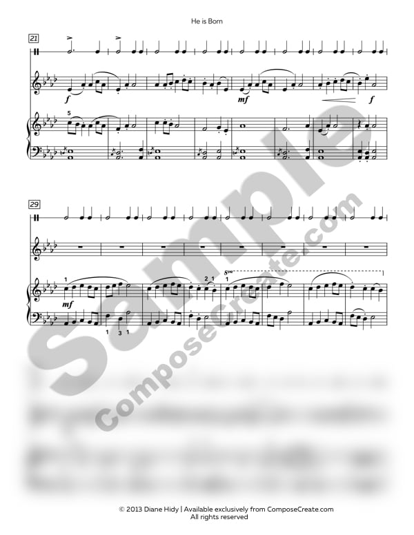 He is Born Duet with C Instrument and drum includes a full score for that includes the C instrument, drum, and piano. The smallest note value in the piano part is an eighth note, and pedaling is not indicated but light pedaling will no doubt be added as it is performed. Helpful fingerings and dynamics are included. The piece begins in Ab, and ends in A, adding to the feeling of rejoicing and celebration.
