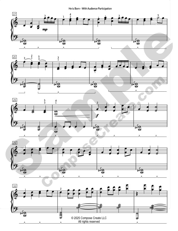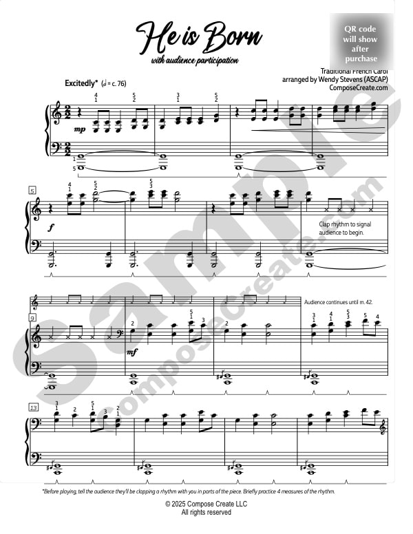 He is Born with audience participation comes as a studio license which means that you only have to purchase it one time, and you are then licensed to print as many prints as you need for yourself or any student you directly teach! It’s like getting an unlimited supply of the piece since you never have to pay for it again, plus there is no shipping. You get the PDF and bonus mp3s in your email within minutes of your purchase.