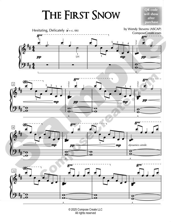 The 2025 Holiday Music Bundle includes mp3 recordings and QR codes of all seven (- actually eight) pieces performed by Wendy Stevens. You are permitted to send the mp3 example performance tracks to your students to help them learn the pieces, and the QR codes are instantly available on the title page of the score.