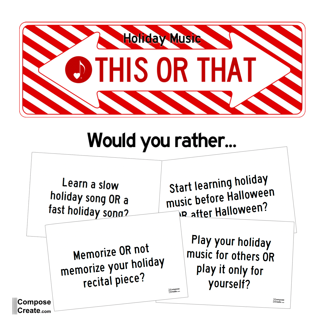 The local music teachers association held a teen night. This or That was a terrific break the ice game. I look forward to playing Holiday This or That this season with my students. This is a good game to play between materials during lesson.