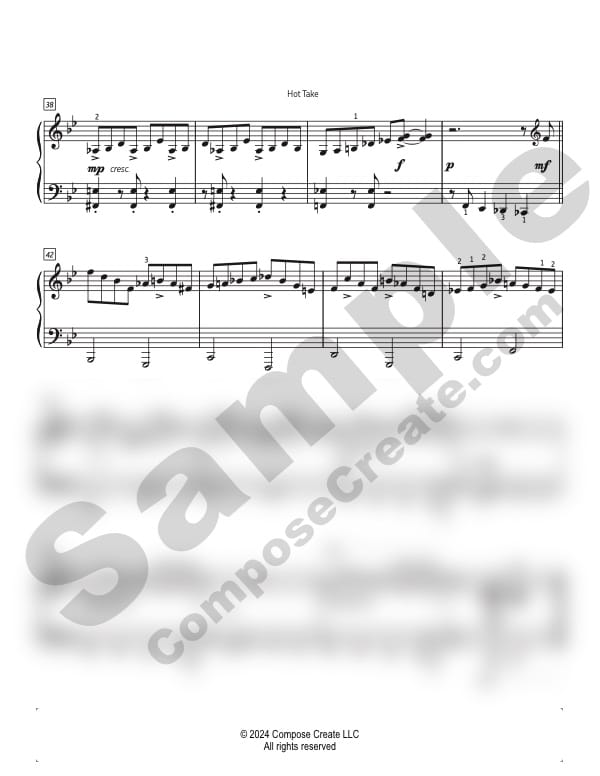 Hot Take is late intermediate level and is composed in the key of B Flat Major. The piece is written in common time and is played with straight eighth notes. The smallest note value is the eighth note. Dynamics, and helpful fingering are all included.
