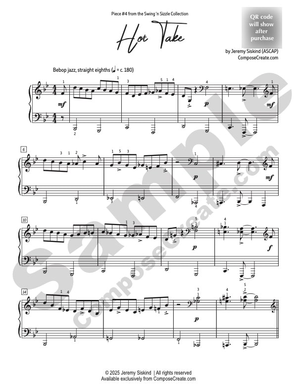 With your purchase of the Hot Take studio license, you will receive a bonus mp3 recording of the piece performed by Jeremy Siskind. You are permitted to send this example performance track to your students to help them learn the piece.