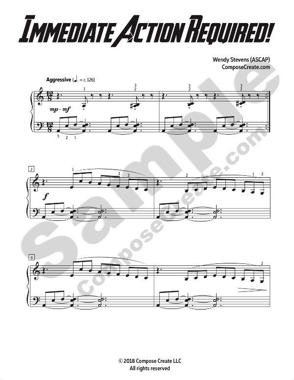 Immediate Action Required comes with a bonus mp3 recording performed by Wendy Stevens. You are permitted to send this example performance track to your students to help them learn the piece.