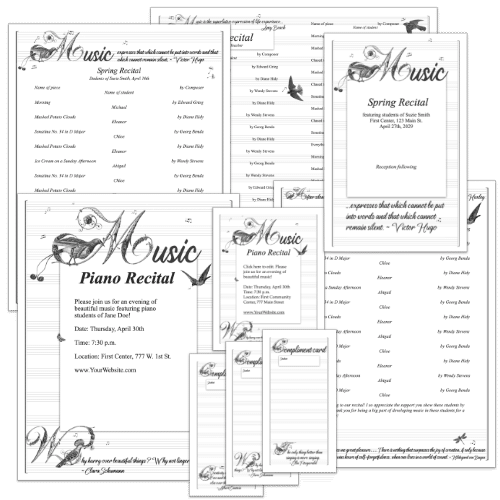 - Includes: 8.5Ă—11 invitation poster, 4-up invitations, front and back recital programs (in both vertical and booklet style), compliment cards.