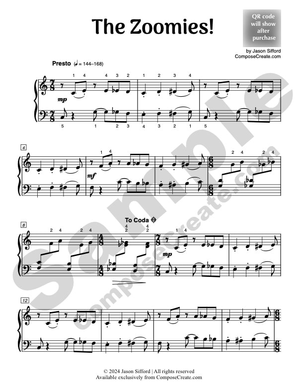 Plus, a QR code is included on the first page of the PDF (not pictured in the sample) so students can scan the code and it will take them directly to the performance recording of the piece. This can help them be inspired and learn the piece even more effectively without you having to send the mp3 to them!