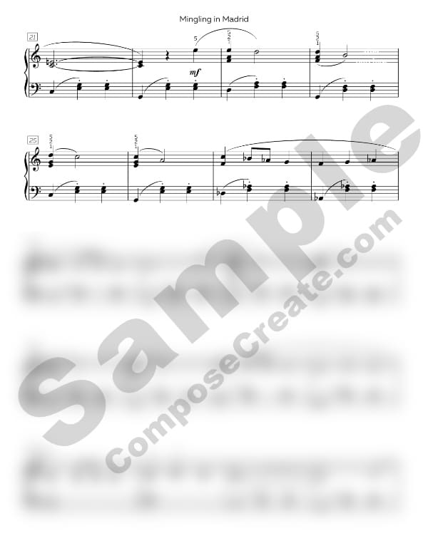 Mingling in Madrid is in C Major and set in triple meter. The left hand provides a waltz accompaniment pattern, and the right hand melody moves the piece forward with one scale pattern, chord inversions, and some flats. The left hand also contains some flats. Both hands play D flat Major and E flat Major chords at the ending.