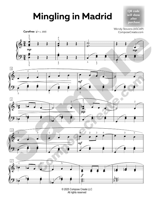 Mingling in Madrid comes with a bonus mp3 recording performed by Wendy Stevens. You are permitted to send this example performance track to your students to help them learn the piece.