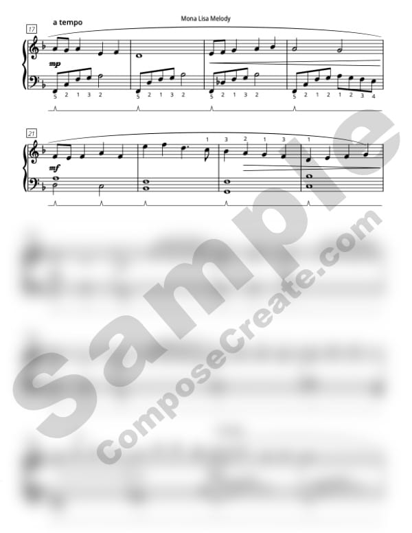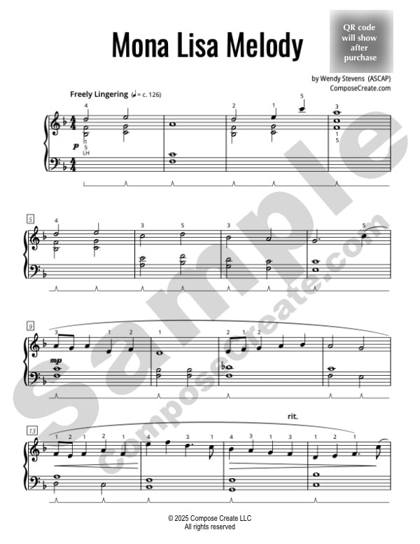 Mona Lisa Melody is in F Major and set in common time. The smallest note value in this piece is the eighth note. Mona Lisa Melody features harmonic pedaling throughout the piece and is written in so students don’t have to guess where to lift. The biggest interval is a seventh. The piece is carefully edited with pedagogical fingering and articulations, making this an excellent teaching or recital piece!