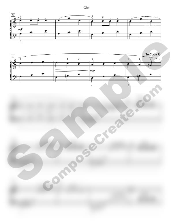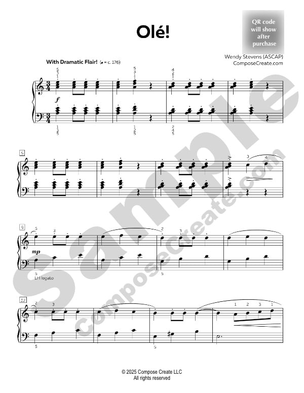 Olé! is in A minor and set in common time. This piece opens with dramatic, and yet accessible chords and chord inversions in both hands. It contains hand-crossing arpeggios, parallel triads, and staccato against legato.