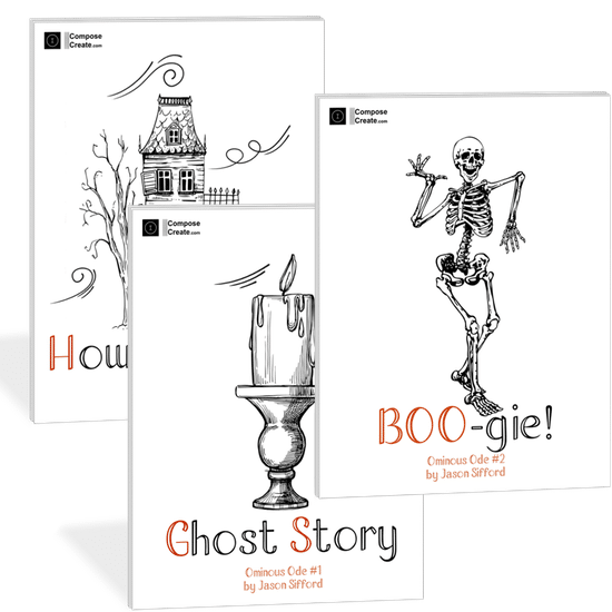 As with all ComposeCreate® music, all three of these pieces in the Ominous Odes Bundle comes with the creative and fun cover. But we also include an mp3 recording of the composer, Jason Sifford, playing the pieces. This can help inspire and help students learn the piece quickly during the short Halloween season.