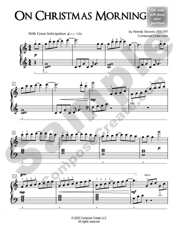 On Christmas Morning comes with a bonus mp3 recording performed by Wendy Stevens. You are permitted to send this example performance track to your students to help them learn the piece.