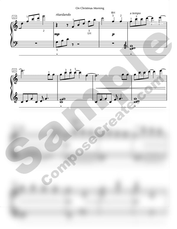 On Christmas Morning is a late elementary solo in common time. It is written in C Major. The eighth note is the smallest note value, and the main motives feature simple syncopations. The B section showcases parallel second inversion chords in the right hand. There is frequent use of ledger line notes for the right hand. The left hand plays three full seventh chords (i.e., with four notes in the chord), but the smallest interval is a 7th. On Christmas Morning contains easy-to-learn motives that fit easily under the hands, and the pedagogical fingerings and careful editing make hand position changes and cross-hand sections feel natural.