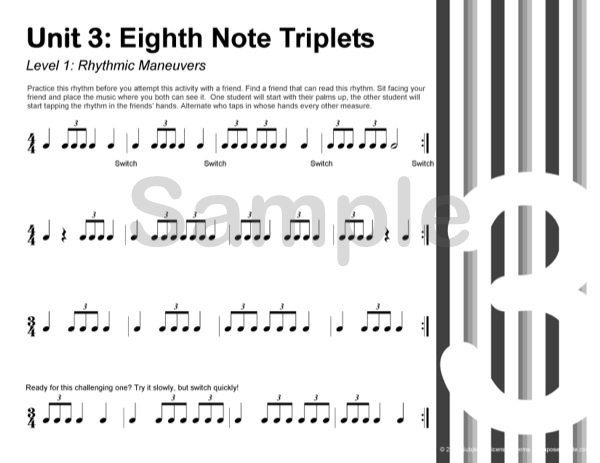 - Rhythm Concepts Covered: Quarters and halves (easy), eighth notes, triplets, and sixteenth notes