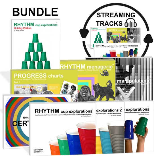 For the tracks, the studio license means that you may use the tracks in your studio but tracks tracks are secured and cannot be shared. Students will need to purchase their own track subscription to use at home: Rhythm Cup Explorations® 1 – Streaming tracks, Rhythm Cup Explorations® 2 – Streaming Tracks, My First Rhythm Cup Explorations® – Streaming tracks, Rhythm Menagerie® – Streaming Tracks, Rhythm Manipulations® – Streaming Tracks.