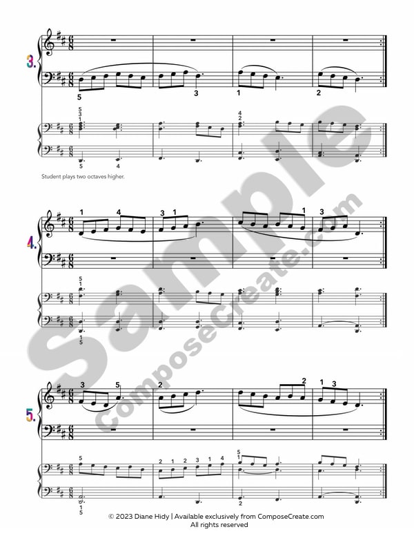 These exercises are wonderful melodies that instantly apply students’ acquisition of new scales or similar exercises- (consider this a request, Diane, 🤗) chords, cadences, arpeggios, and intervals in isolated keys. For my students who are reluctant to learn keyboard theory, these are priceless jewels for motivation. Plus they are fun duets that are truly quite pretty. I am grateful for these and other Compose Create works that keep students interested and advancing! ⭐️⭐️⭐️⭐️⭐