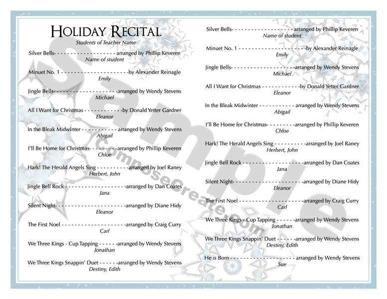 In this Snowflake Recital Program Template Package, you get three different kinds of files so that you can have just the right file type that you need. The files have text boxes them in which you can type your students and their pieces. Just enter your students name and information, print, and you are set!