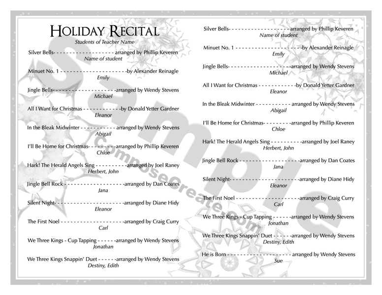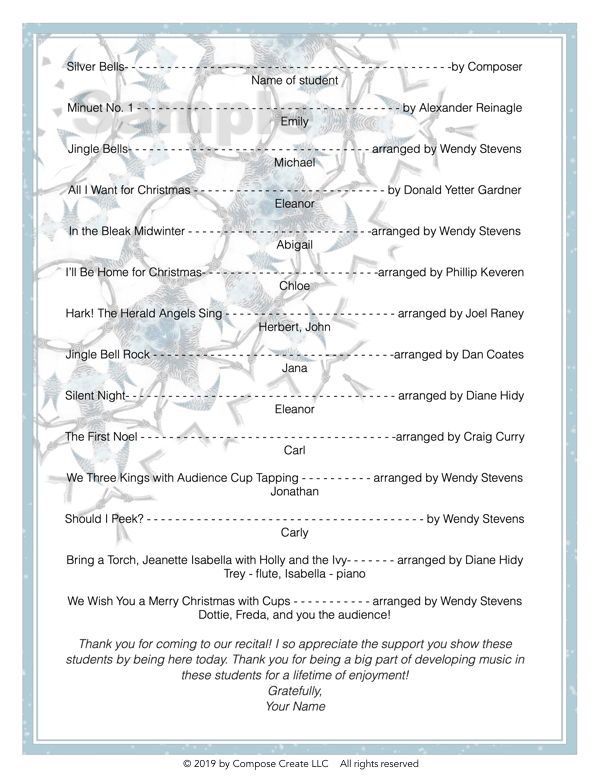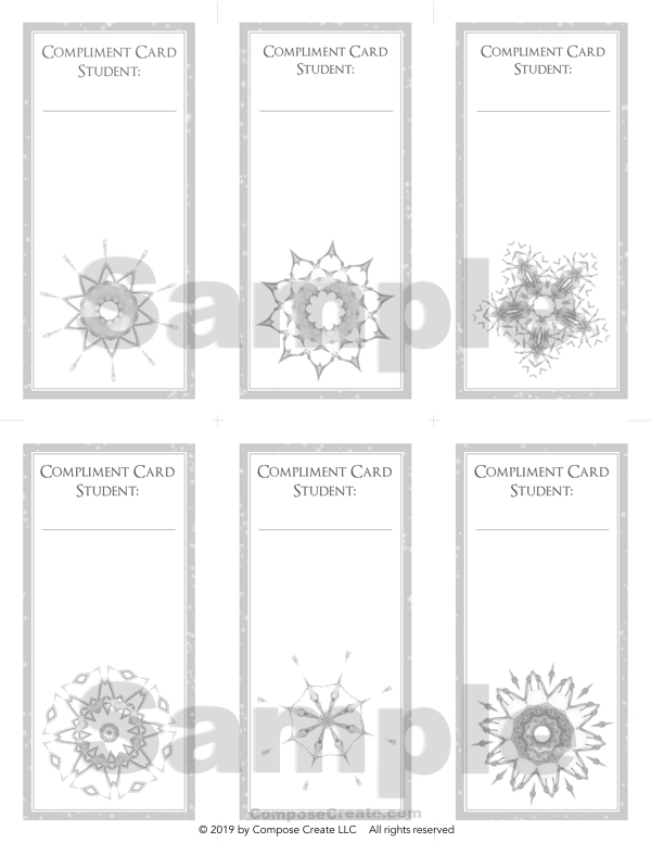 - We’ve included beautiful Recital Compliment Cards with different snowflakes on each. The recital compliment exchange continues to be raved about among teachers who use it. Keep your audience actively listening and encourage and inspire your students at the same time.