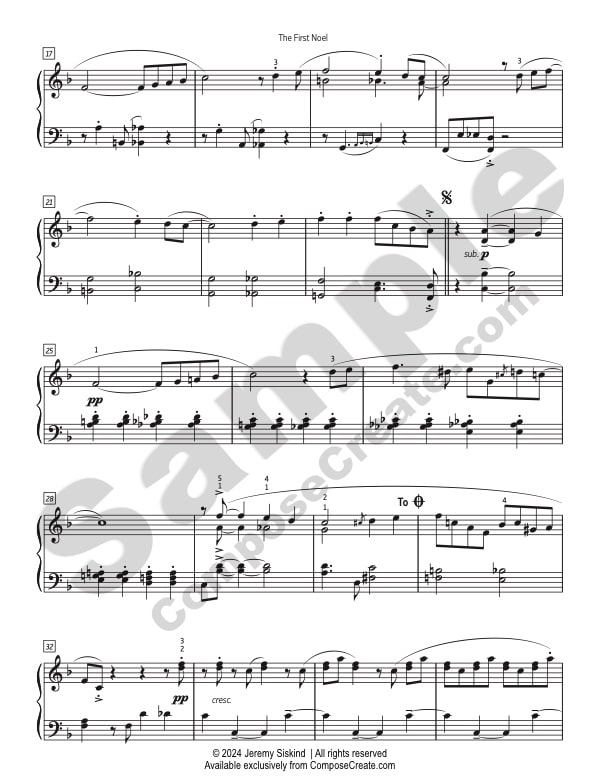 The First Noel is late intermediate level and is composed in the key of F Major, with a key change to D Major. The piece is written in common time. The smallest note value is the eighth note/eighth rest. Jazz harmony and syncopation occur throughout the piece. Accidentals and articulations like tenuto and accent marks also occur throughout. Dynamics range from pianissimo and subito piano to forte. A moderate swing and sparse pedaling is recommended for this piece.