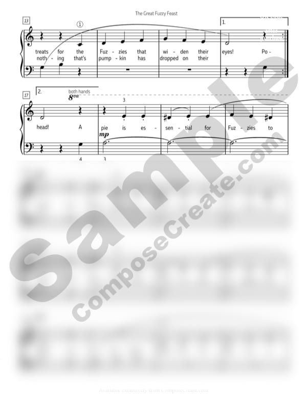 The Great Fuzzy Feast is an elementary level piece that contains four verses of adorable and clever lyrics (with several settings). It is written in triple meter with a hand position that resembles Middle C position, but without the thumbs sharing Middle C. The right hand plays 2 sharps consistently and moves around the piano to different positions, but ones that are easy to remember.