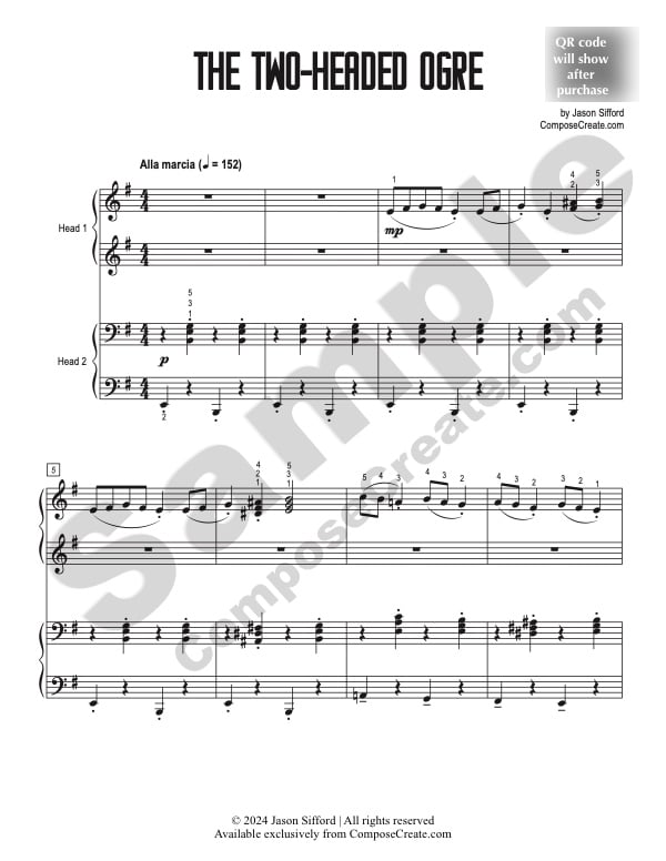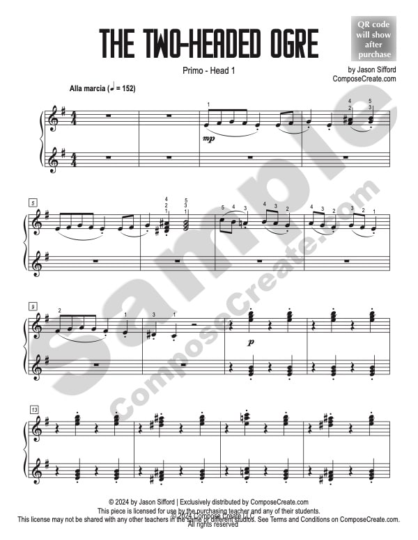 With your purchase of the Two-Headed Ogre studio license, you will receive a bonus mp3 recording of the piece performed by Jason Sifford and his duet partner. You are permitted to send this example performance track to your students to help them learn the piece.