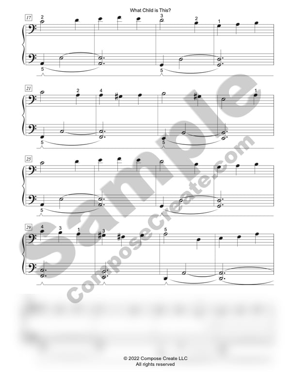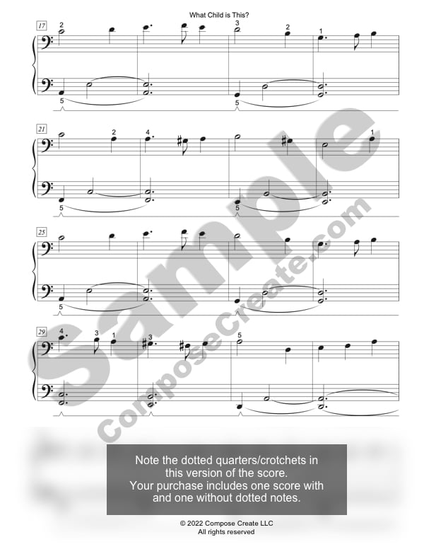 There are two versions of What Child Is This elementary. One has the dotted quarter notes notated (so this would be late elementary), and another only uses quarter notes (so elementary). You will receive both versions with the studio license purchase so that you can decide what to show your student, and whether to have your student play with the dotted quarter note.
