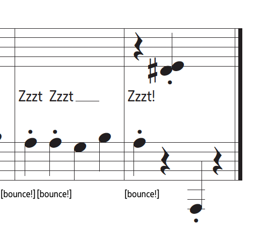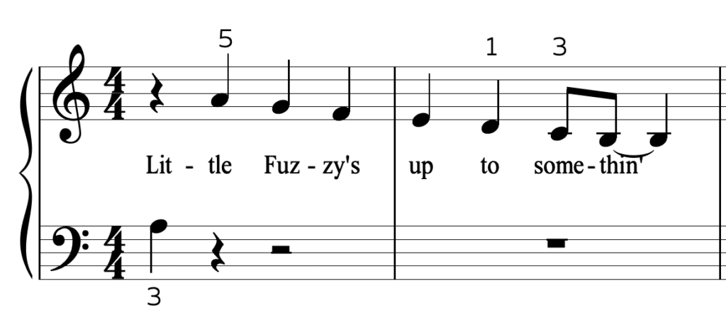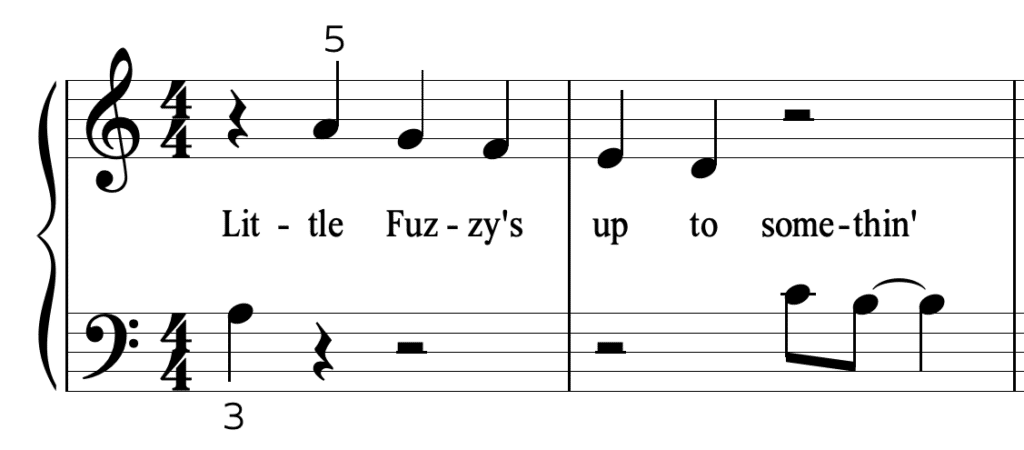 But one detail I will tell you: At the end of April Fools’ Mischief, the students get to bounce up on the piano bench every time they play an A! (That’s the April Fools’ joke the Little Fuzzies rigged with their power tools at the piano.) I noticed that the original way I composed it was a little difficult because it required the student to bounce on beats 1 and 2 of that measure: