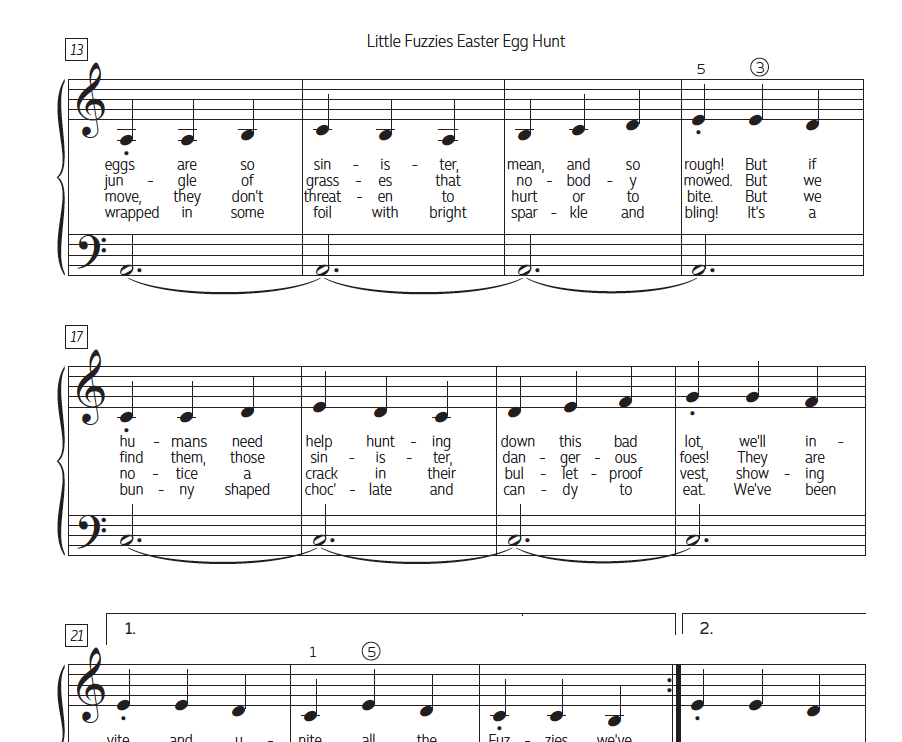 After the lyrics are written in a separate program (see my other post about how I lost it all the other day) and the music is notated, it’s time to actually type the lyrics into the score. Most notation programs do a decent job of this, but sometimes, a piece with multiple verses becomes quite a challenge. In the case of the Easter Egg Hunt, I had to decide what to do about the fact that the piece repeated and that there was a word on first beat of the repeat for verses 2-4 but not for verse one. Ugh.