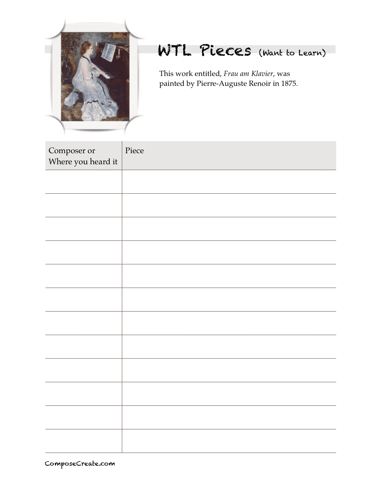 Last week, I shared the form my students use to record the titles of their Practically Perfect Performance Pieces. Today, I thought I’d share the form that we use for their WTL pieces. These are pieces that they “want to learn” at some point in their piano career. I encourage them to write any piece they want to learn including pop, classical, Christmas, etc.